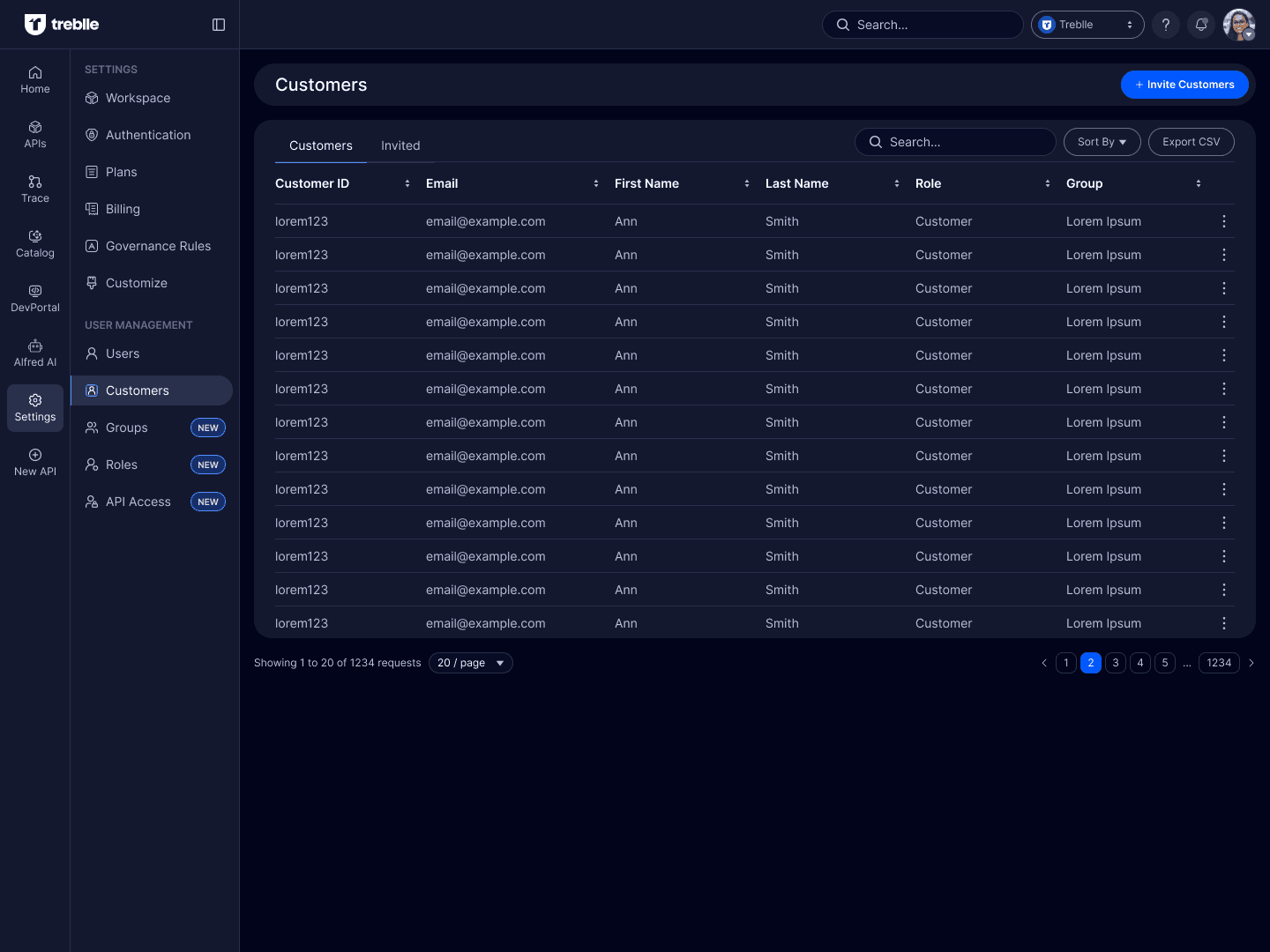 The Customers section manages external users who access the platform with the Customer role.