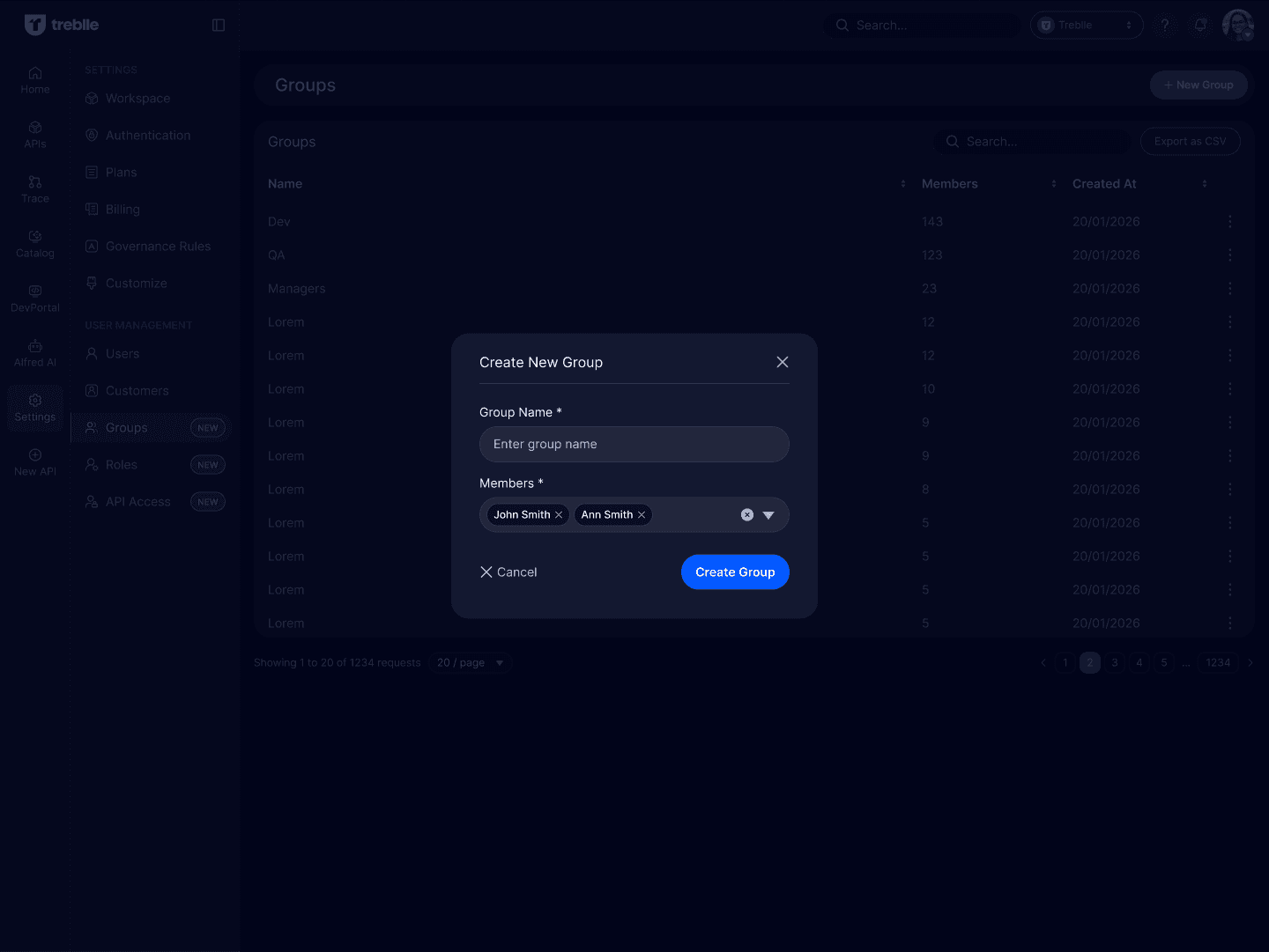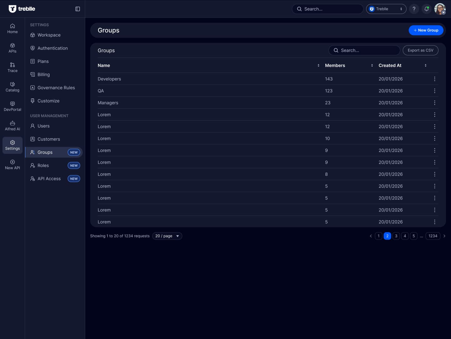 The Groups section is used to organize users and customers and manage their API access collectively.
