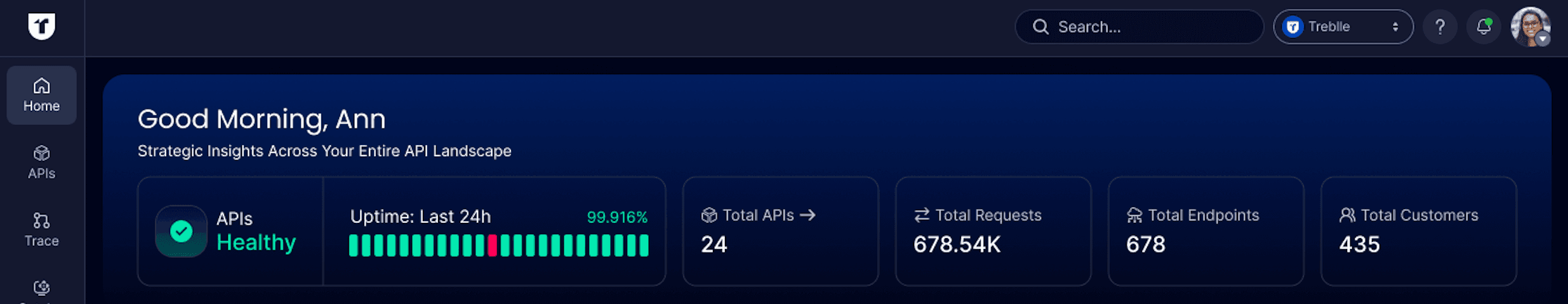 At the top of the Home dashboard, Treblle displays a banner that summarizes the current API health and activity across your workspace.